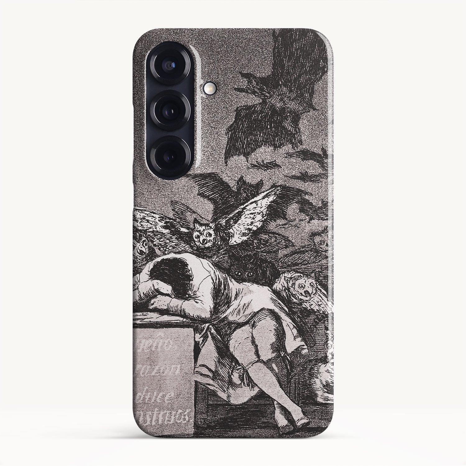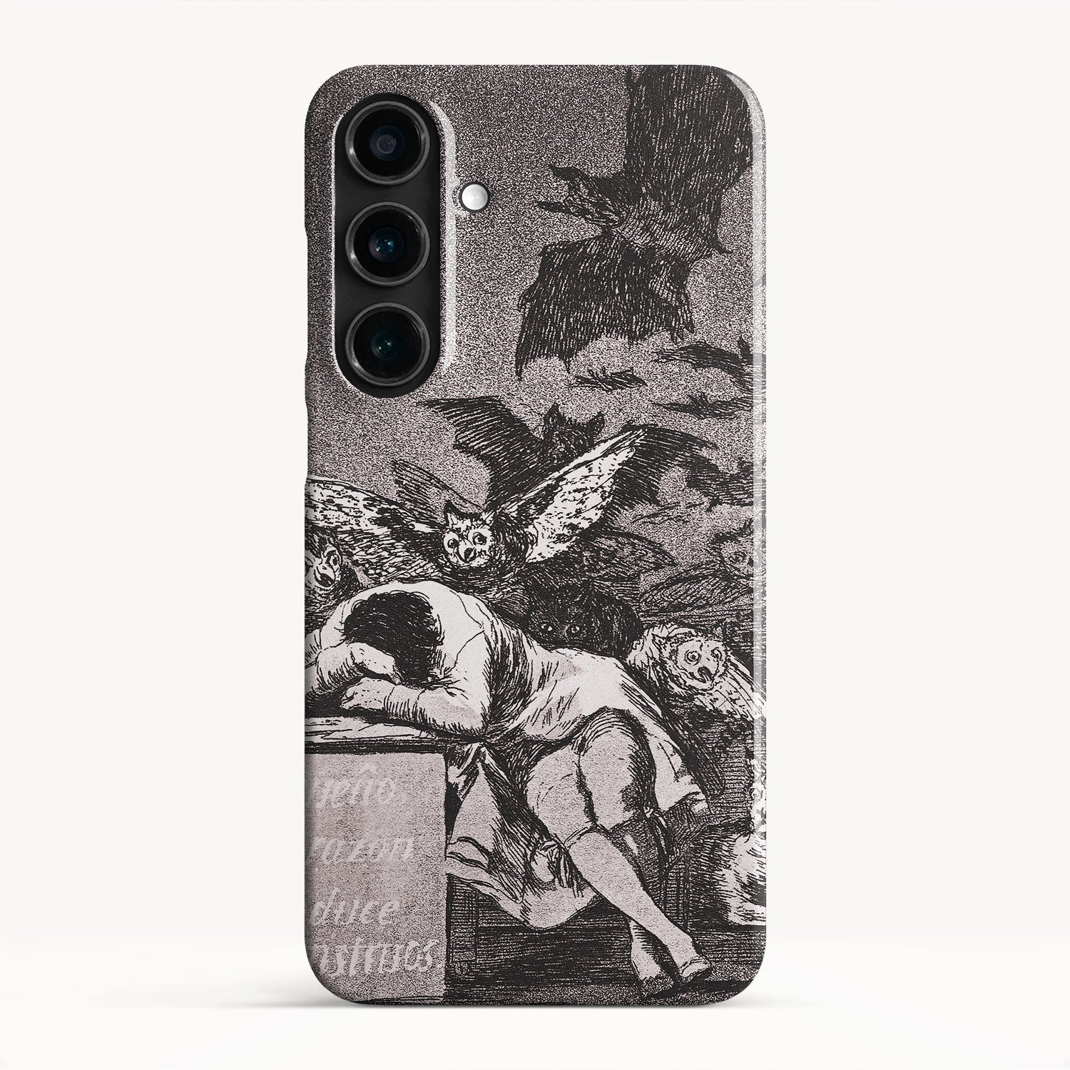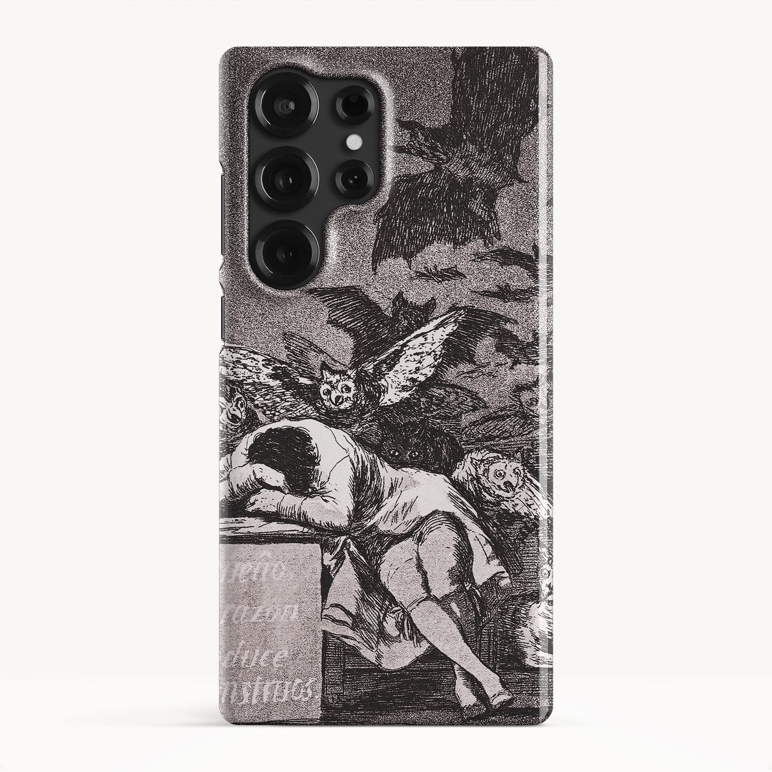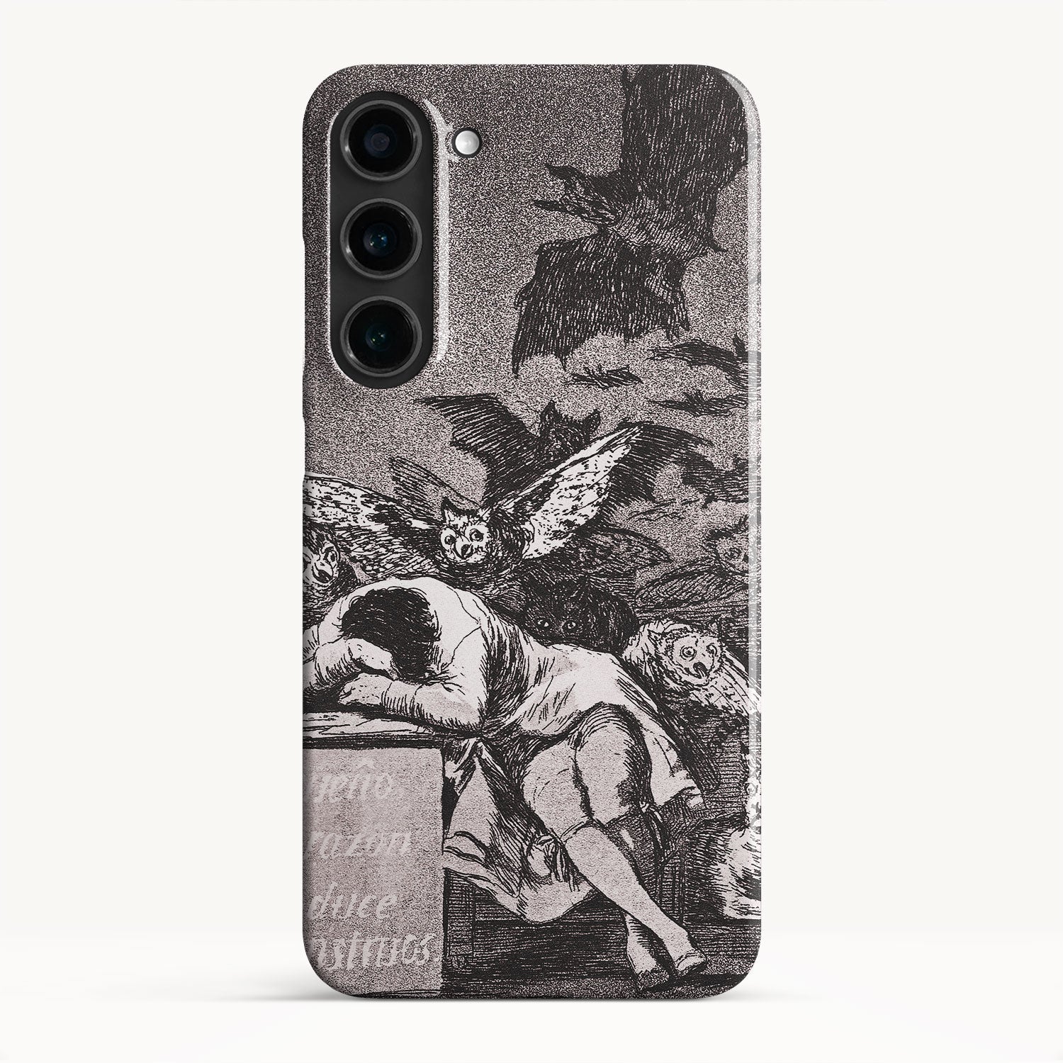 The etching depicts the Goya himself, slumbering at his desk while surrounded by eerie and grotesque creatures. Bats, owls, and nightmarish entities lurk in the shadows, symbolizing the irrational and fearsome aspects of the human psyche that emerge when reason is dormant.
