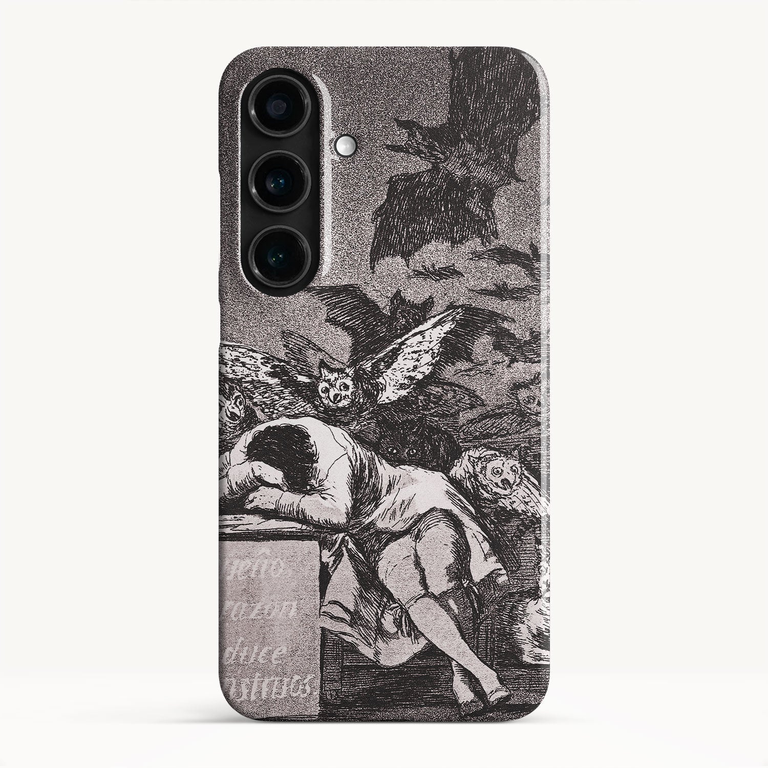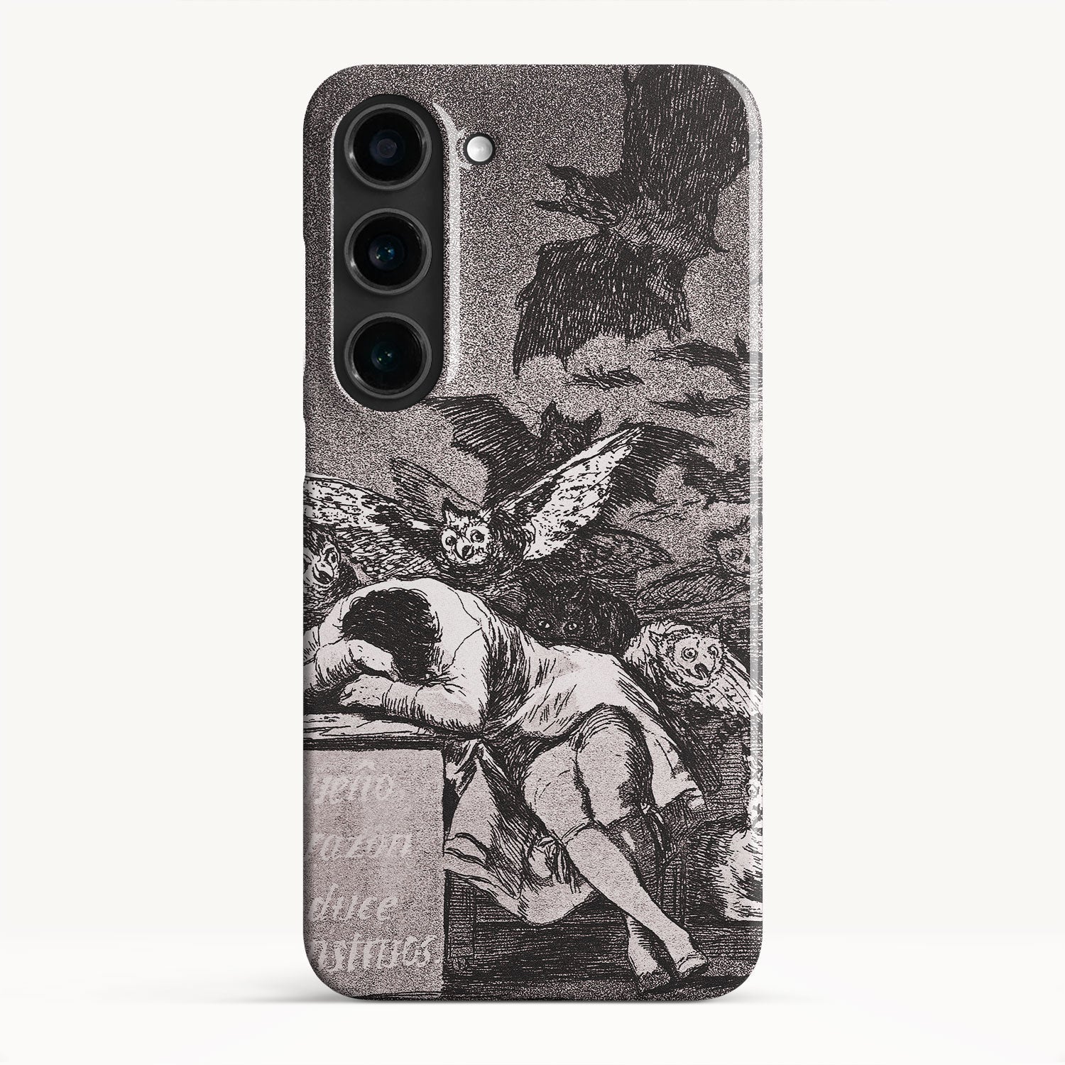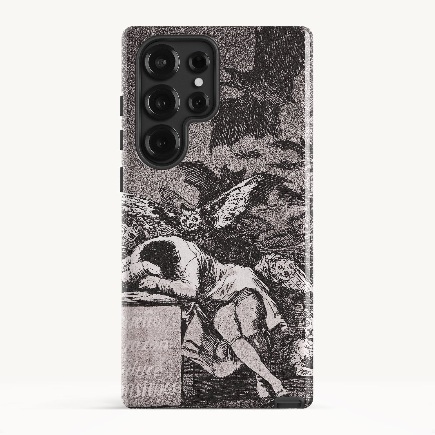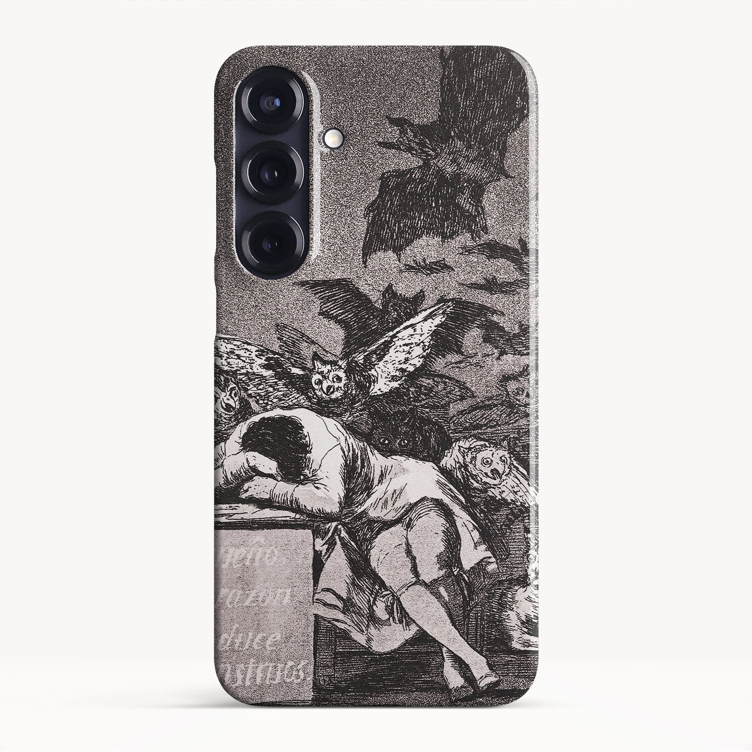 The etching depicts the Goya himself, slumbering at his desk while surrounded by eerie and grotesque creatures. Bats, owls, and nightmarish entities lurk in the shadows, symbolizing the irrational and fearsome aspects of the human psyche that emerge when reason is dormant.