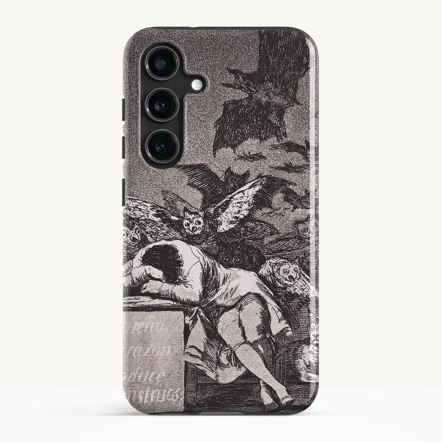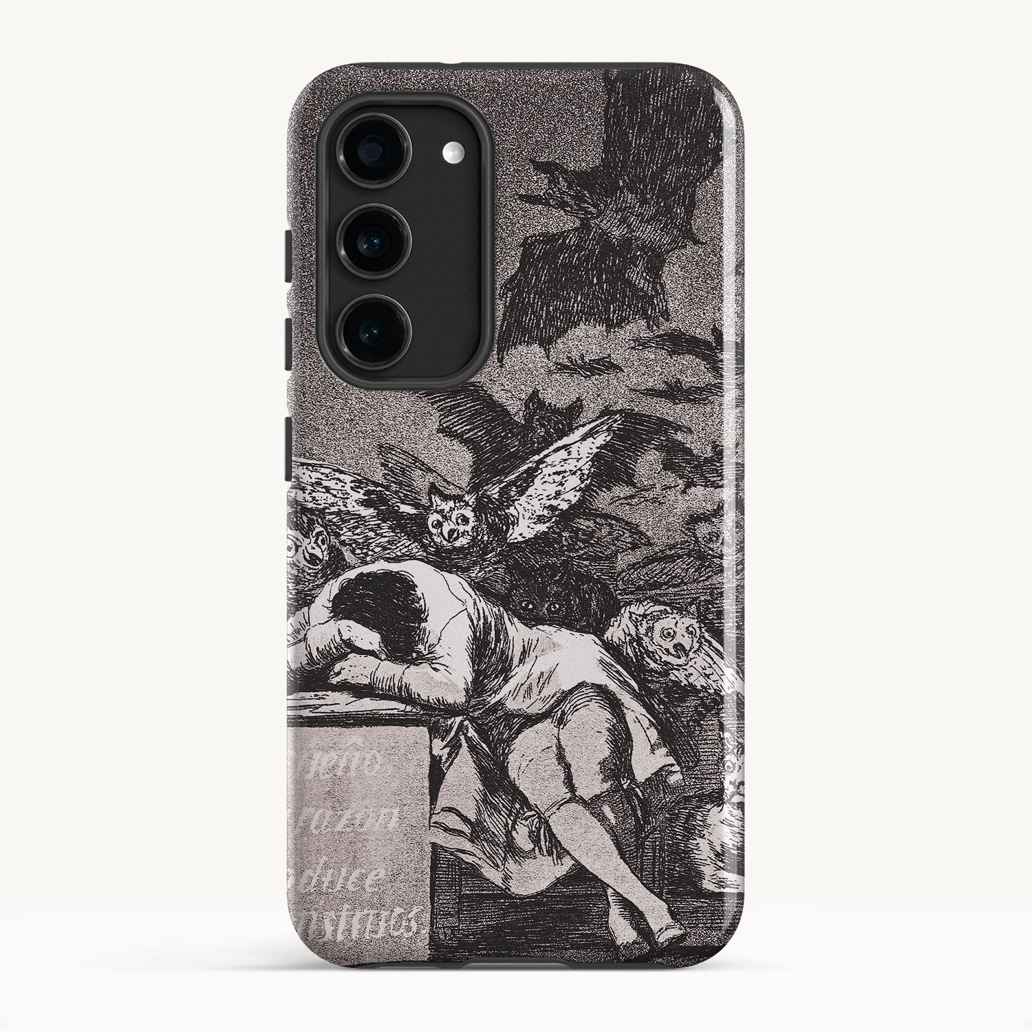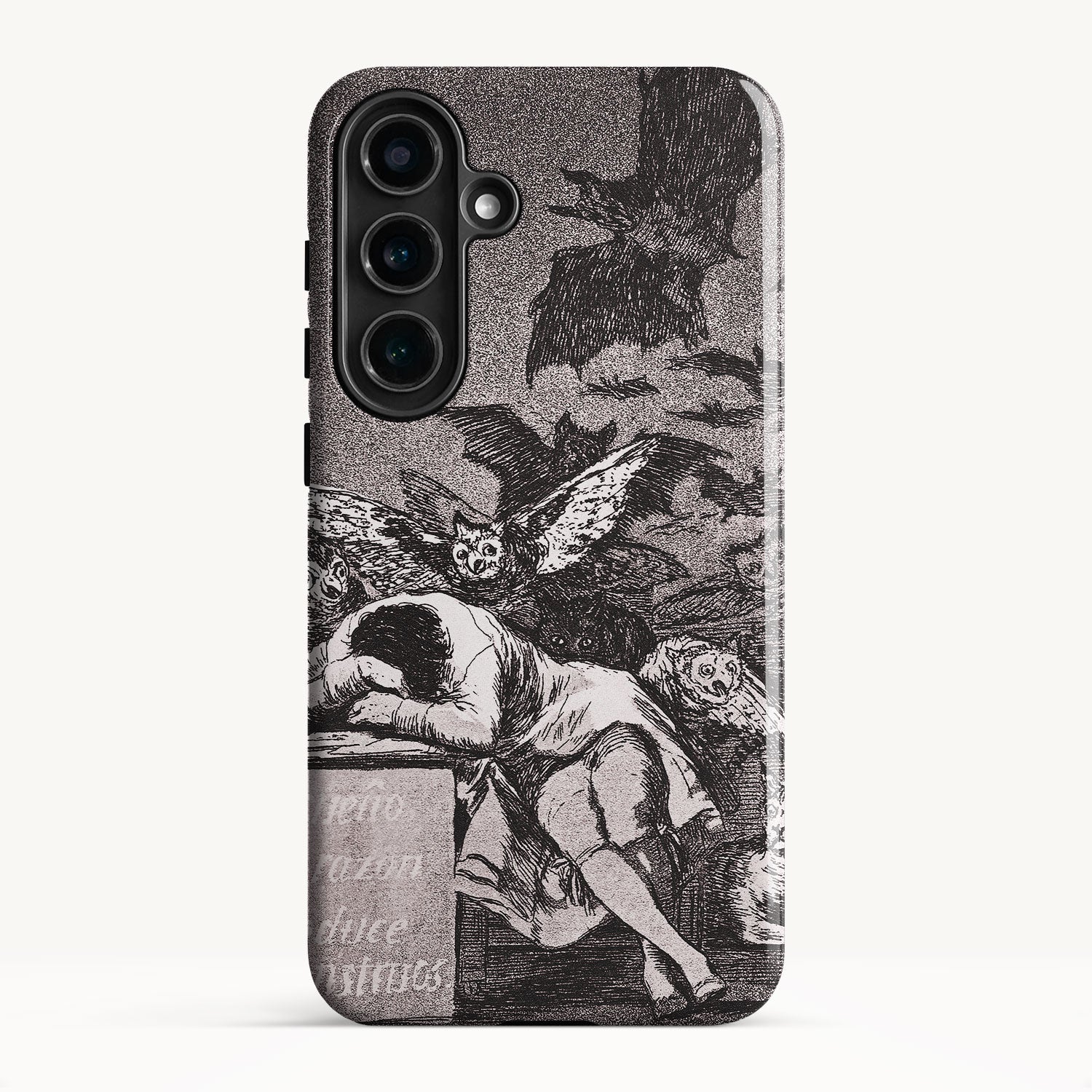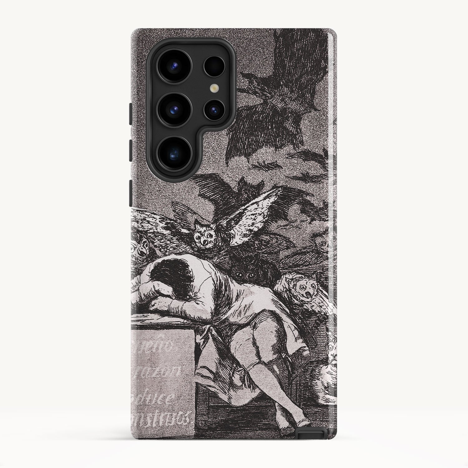 The etching depicts the Goya himself, slumbering at his desk while surrounded by eerie and grotesque creatures. Bats, owls, and nightmarish entities lurk in the shadows, symbolizing the irrational and fearsome aspects of the human psyche that emerge when reason is dormant.