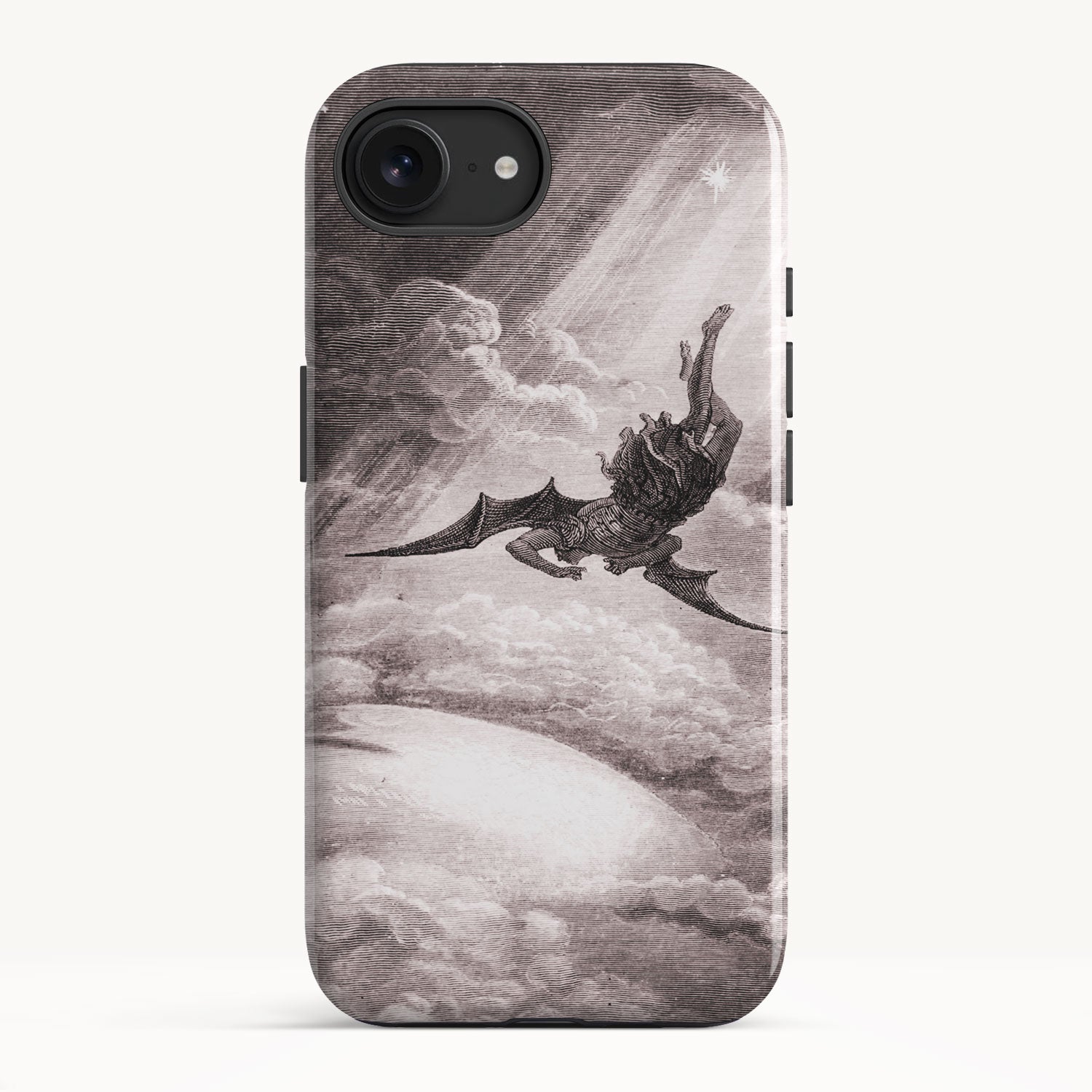 This is one of fifty engravings created by Doré for the epic poem "Paradise Lost" by John Milton. It captures a moment from the fourth book where Satan, the fallen angel and embodiment of evil, descends from the heavens to unleash chaos and destruction upon the Earth.