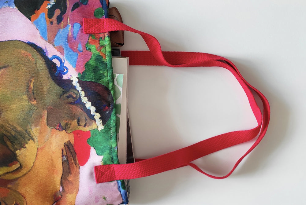 Practical and spacious tote with a choice of black, red or yellow handles. Strong, easy to clean fabric and reinforced stitching allow to carry everything one needs for a day, all year around.