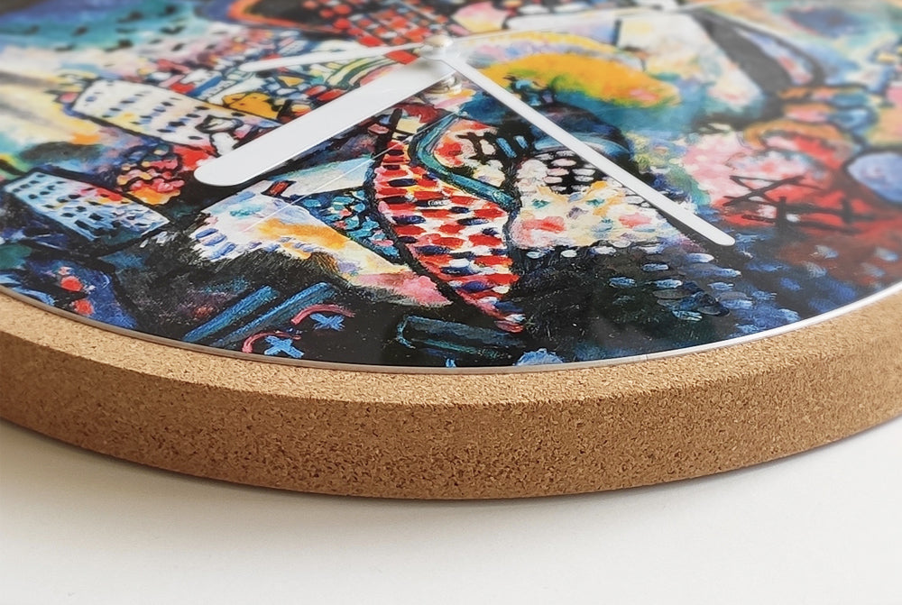 Round wall clock with a cork base and metal face. Hour points can be set as numerals, dots or be removed completely.